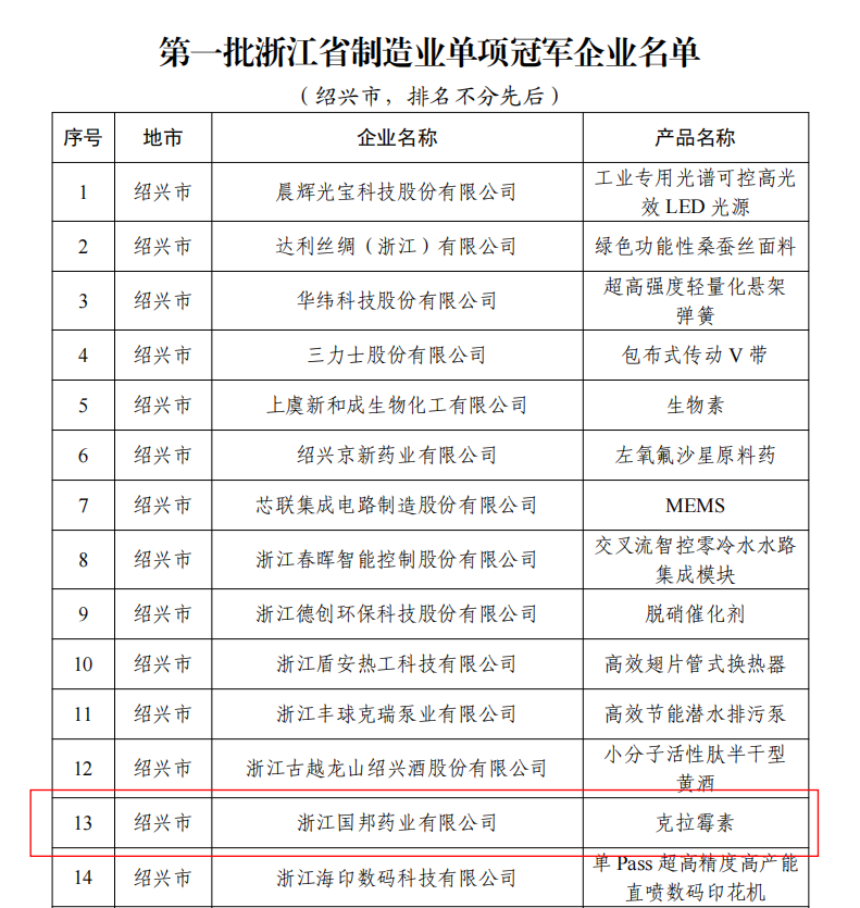 近日,浙江省经济和信息化厅正式公布了第一批浙江省制造业单项冠军企业名单,国邦医药下属浙江国邦药业有限公司“克拉霉素”产品成功上榜!